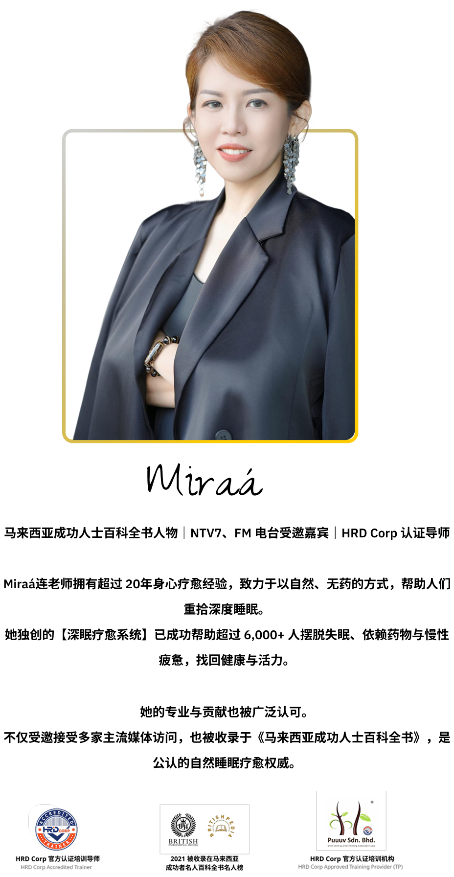 深眠疗愈导师 · 16年自然疗法实践者 · HRD Corp 官方认证讲师