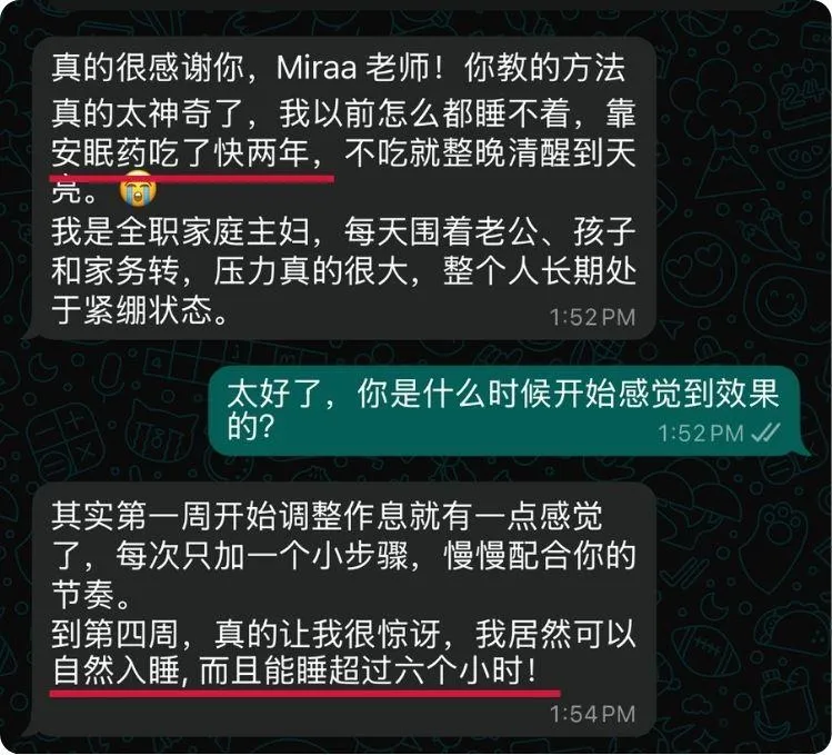 透过调整房间磁场、饮食习惯,加上每天练习 Miraá 老师教的呼吸法, 短短 30 天,我就不再依赖安眠药,甚至能在 15 分钟内自然入睡。